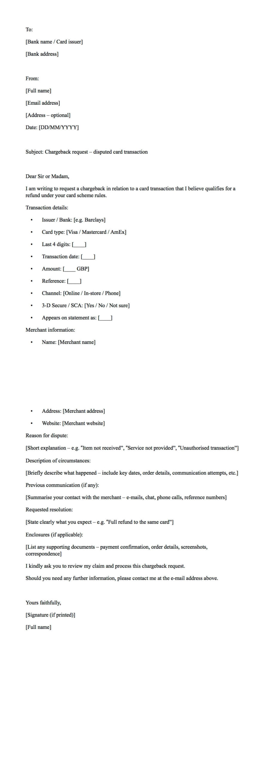 Przykład gotowego pisma: Chargeback (spór z bankiem / kartą) (UK) – letter sample (blur)
