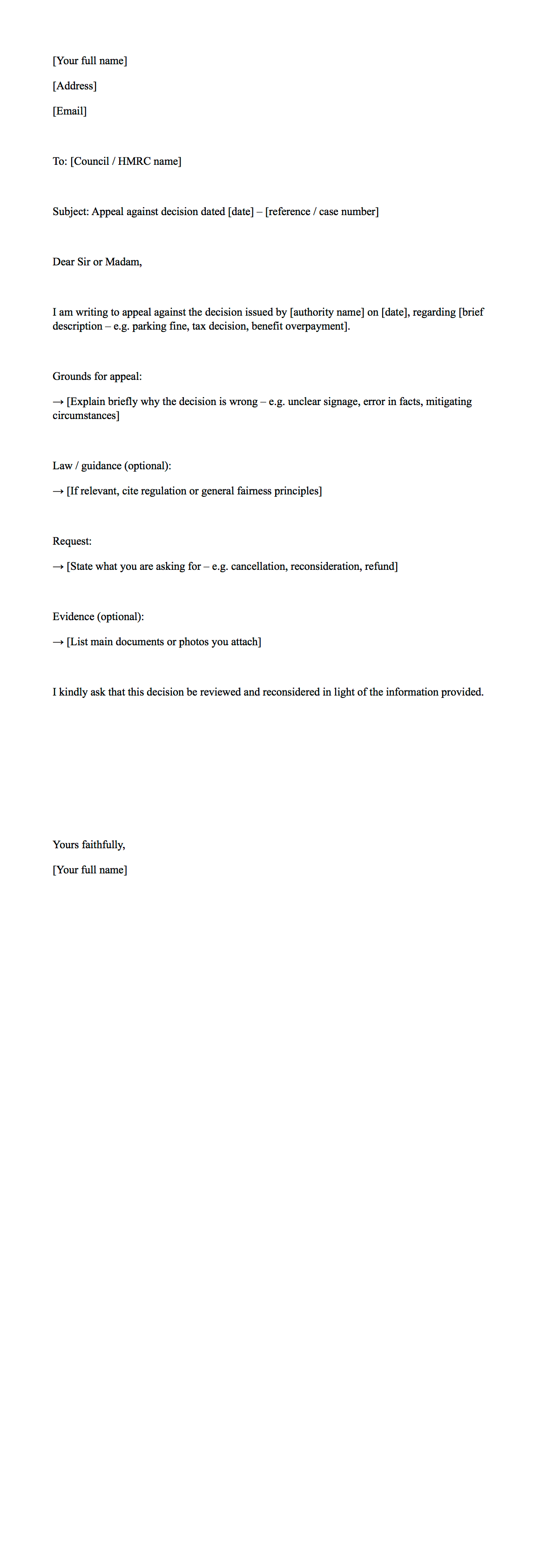 Przykład gotowego pisma: Odwołanie od decyzji (Council/HMRC) (UK) – letter sample (blur)
